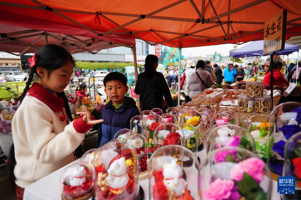 2月12日,小朋友在昆明斗南花卉市场挑选永生花制品摆件。
