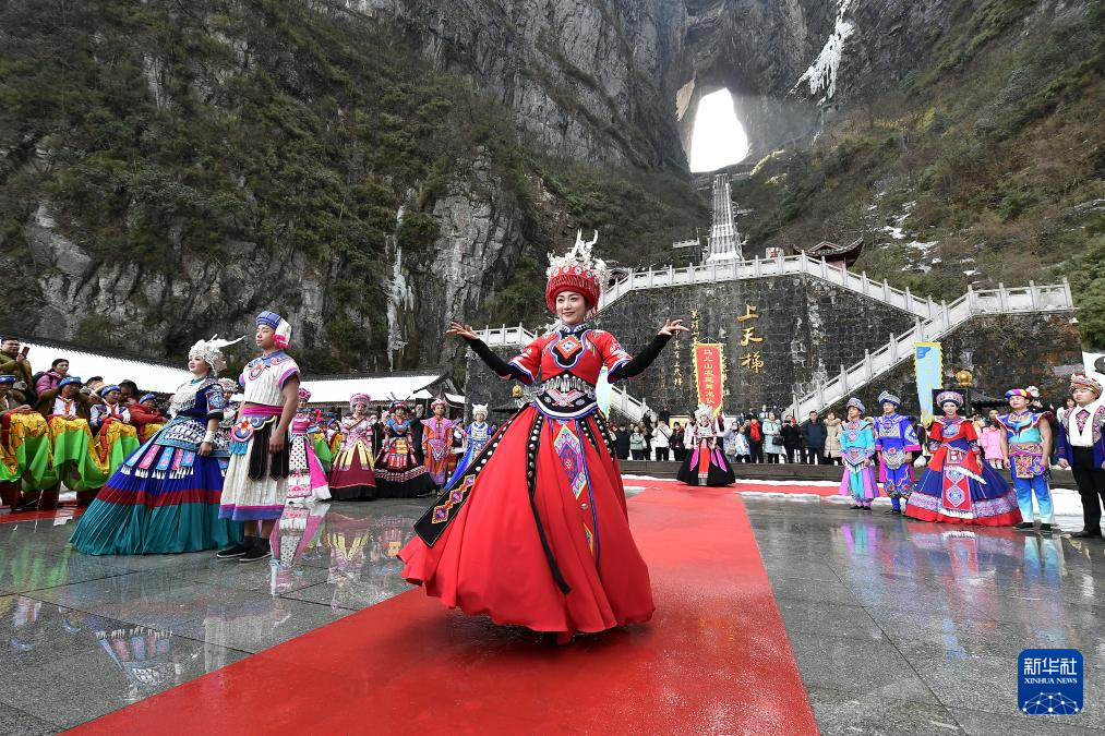 2月12日,游客在湖南省张家界天门山景区观赏民族服饰走秀表演。