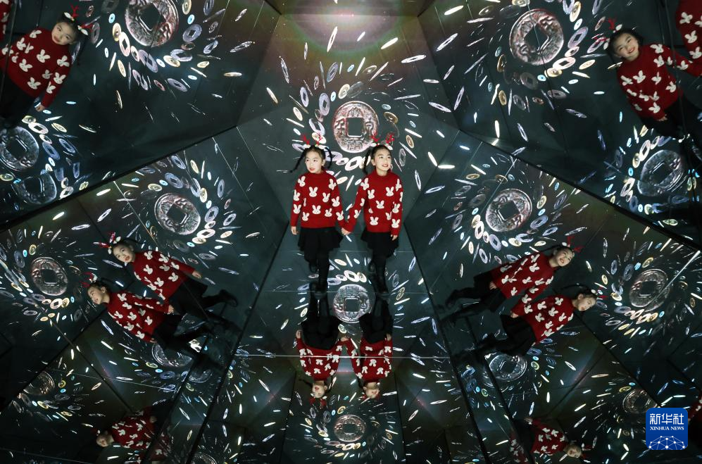 2月12日,一对双胞胎姐妹在浙江省湖州市德清县乾元镇钱币馆游玩。