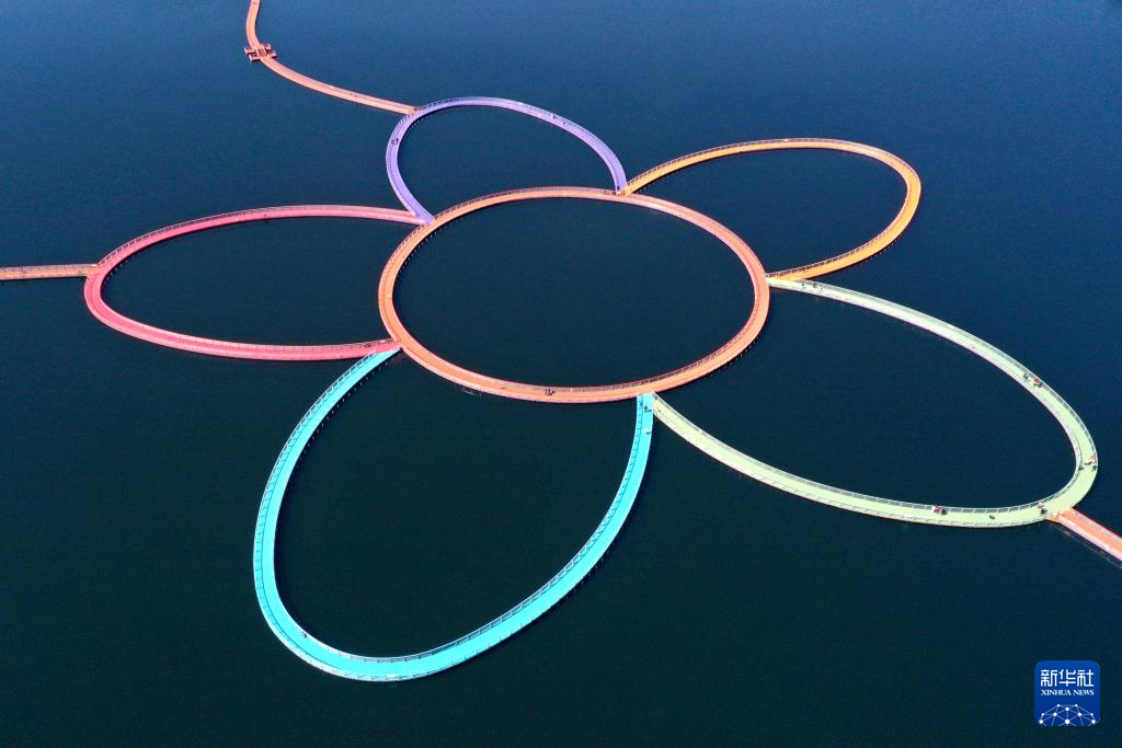2月12日,游客在福建宁德古田县翠屏湖景区水上栈道游玩(无人机照片)。