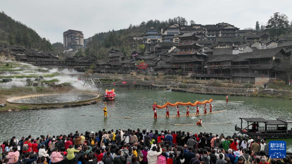 2月12日,游客在贵州省遵义市播州区乌江寨景区观看水上舞龙表演(无人机照片)。
