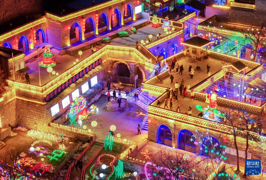 2月11日晚,村民与游客在山西省晋中市平遥县段村镇横坡村观赏民俗彩灯(无人机照片)。