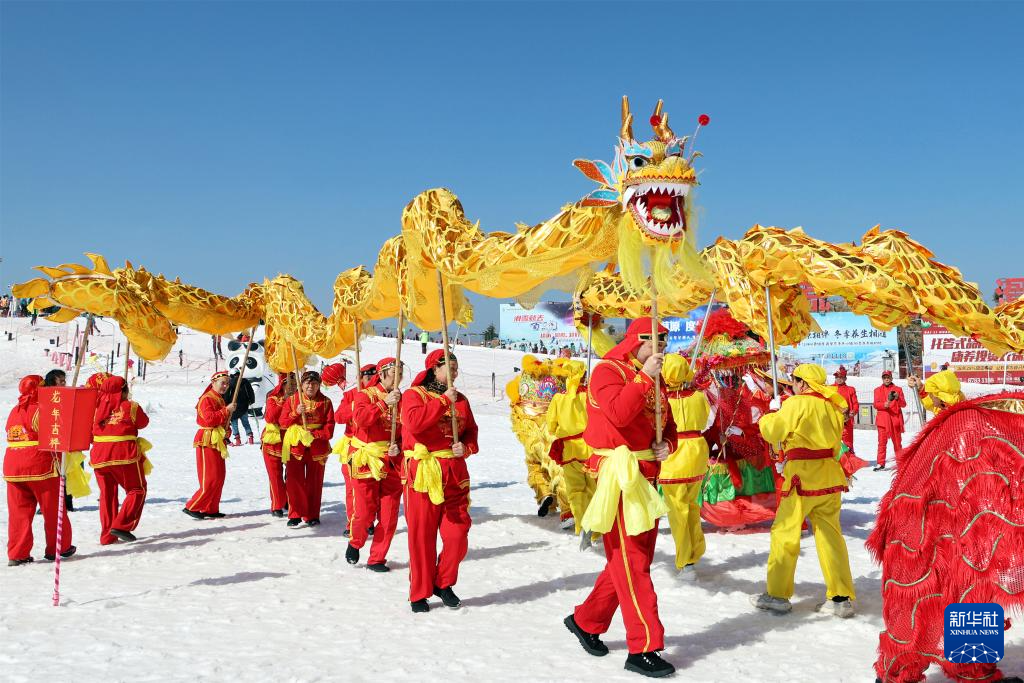 2月12日,湖北省宜昌市夷陵区民间艺术团演员在百里荒旅游度假区的滑雪场里为游客表演舞龙。