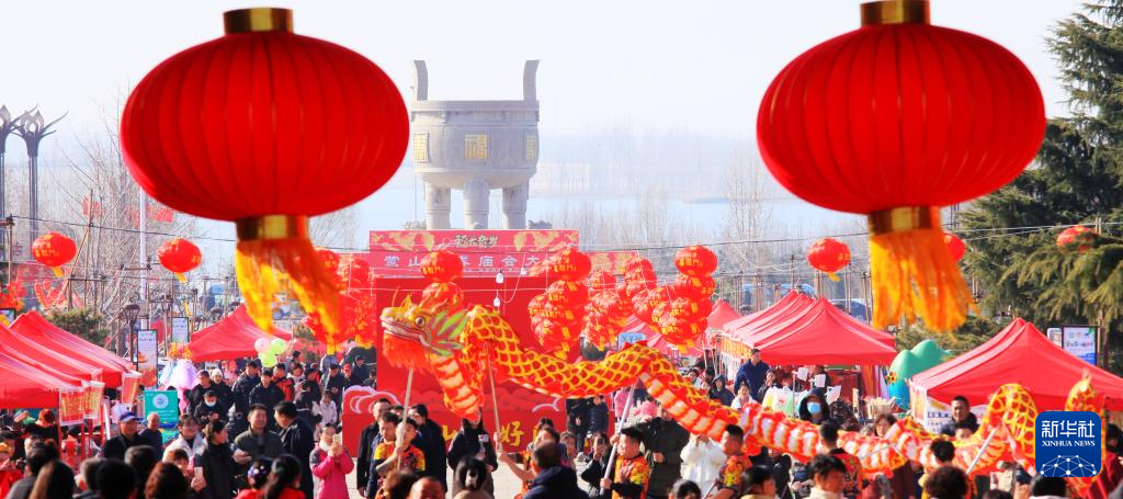 2月12日,民间艺人在山东省临沂市平邑县蒙山龟蒙景区新春庙会上表演舞龙。