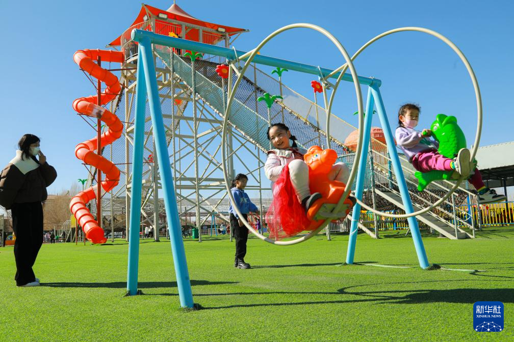 2月12日,小朋友在甘肃张掖甘州区一游乐场玩耍。