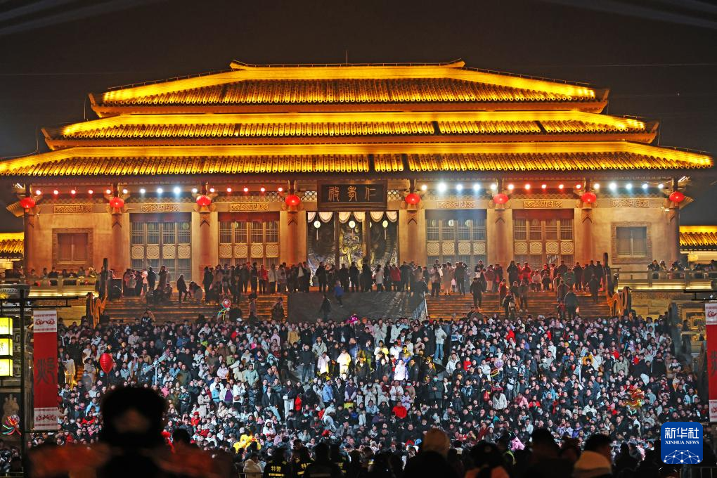 2月11日晚,游客在山东省临沂市郯城县郯国古城景区观看民俗表演。