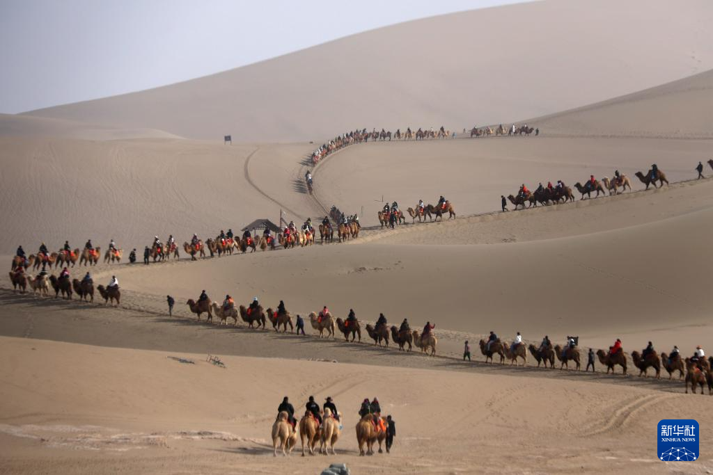 2月12日,游客在甘肃省敦煌市鸣沙山月牙泉景区游玩。