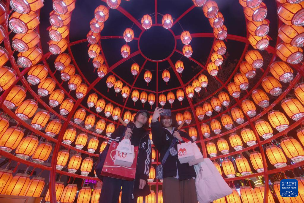 2月11日,在山东青岛西海岸新区金沙滩啤酒城,游客在彩灯前面拍照留念。