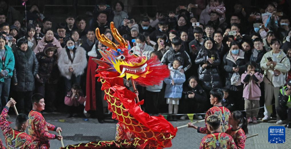 2月11日晚,游客在山东省临沂市郯城县郯国古城景区观看舞龙表演。