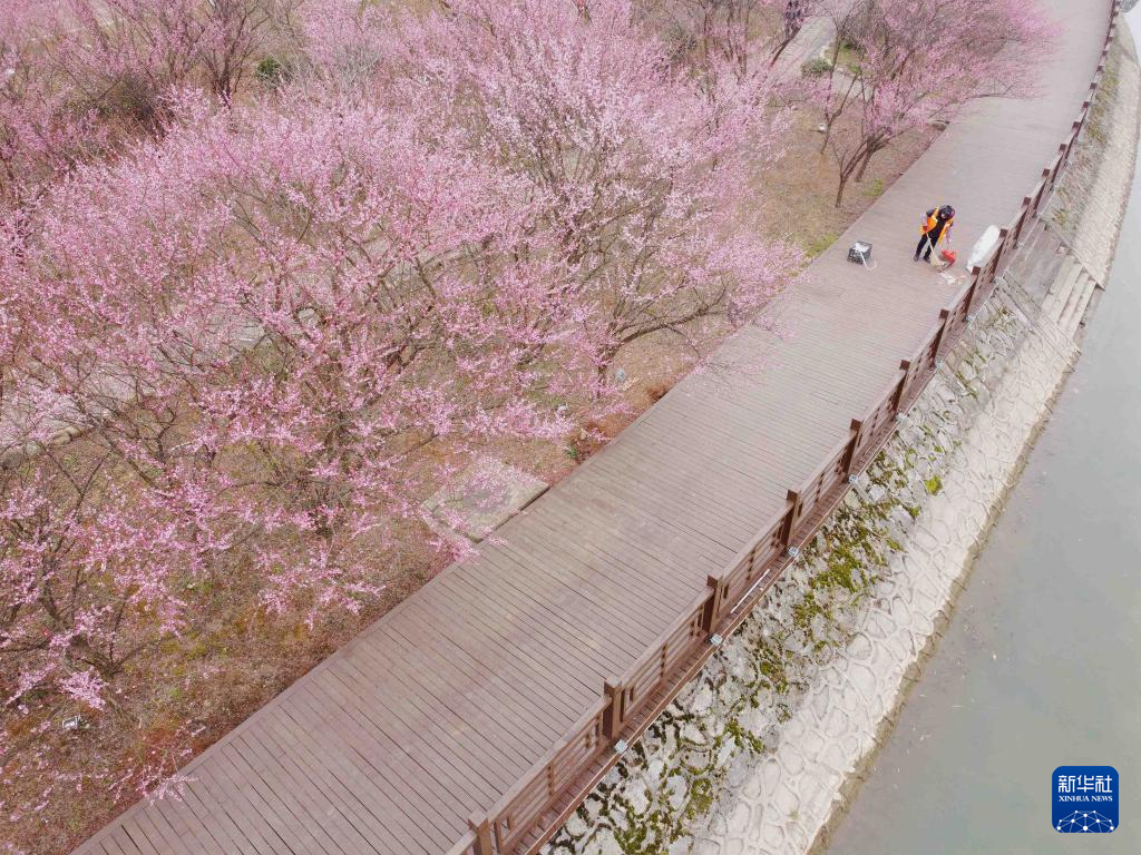 2月11日,环卫工人在贵州省黔东南苗族侗族自治州施秉县河滨公园清扫保洁(无人机照片)。