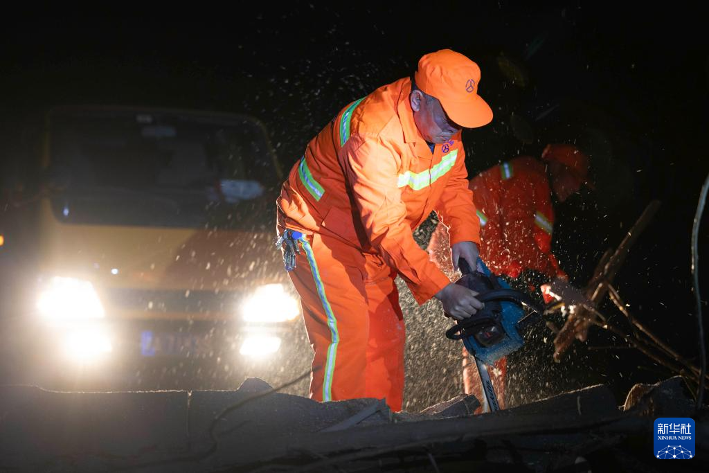 2月12日凌晨,重庆市北碚区公路事务中心养护工人李树全(前)和同事在清理公路倒塌树枝。