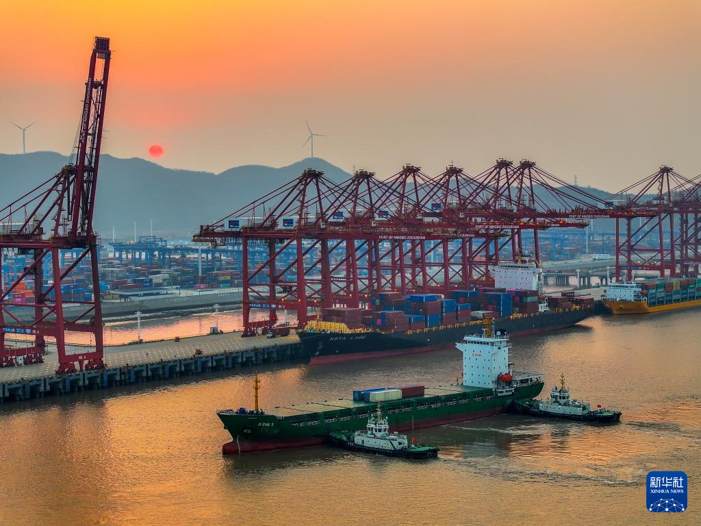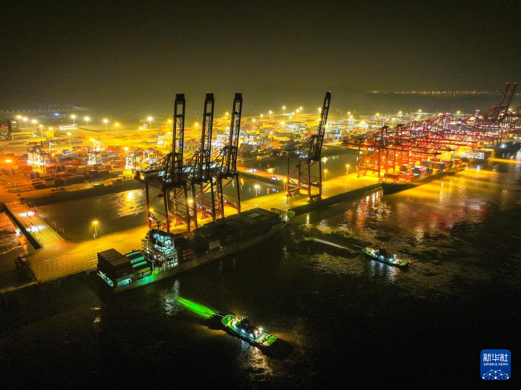 2月11日,宁波舟山港金塘港区船来船往,码头作业繁忙(无人机照片)。