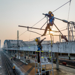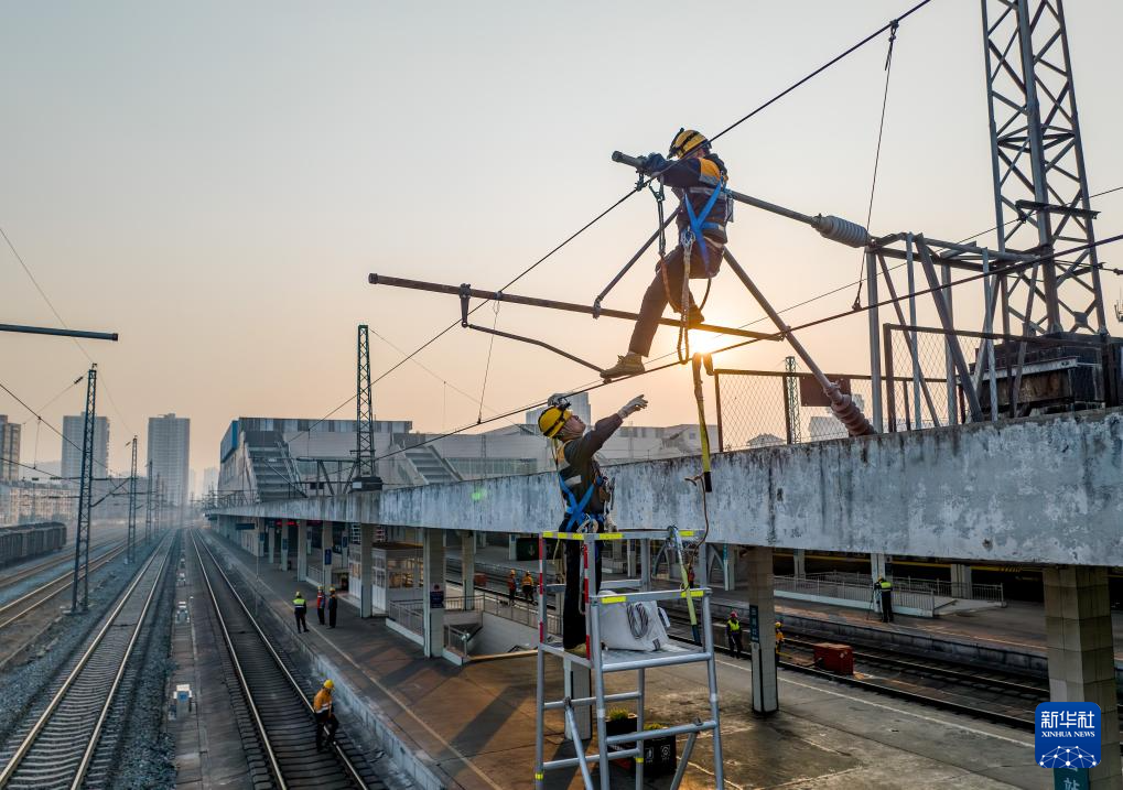 2月10日,中国铁路武汉局集团有限公司襄阳供电段职工在襄阳火车站检修保养接触网设备(无人机照片)。