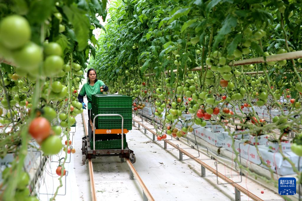 2月11日,在四川省眉山市东坡区西南智慧农业产业园,工作人员在采摘无土栽培的番茄。