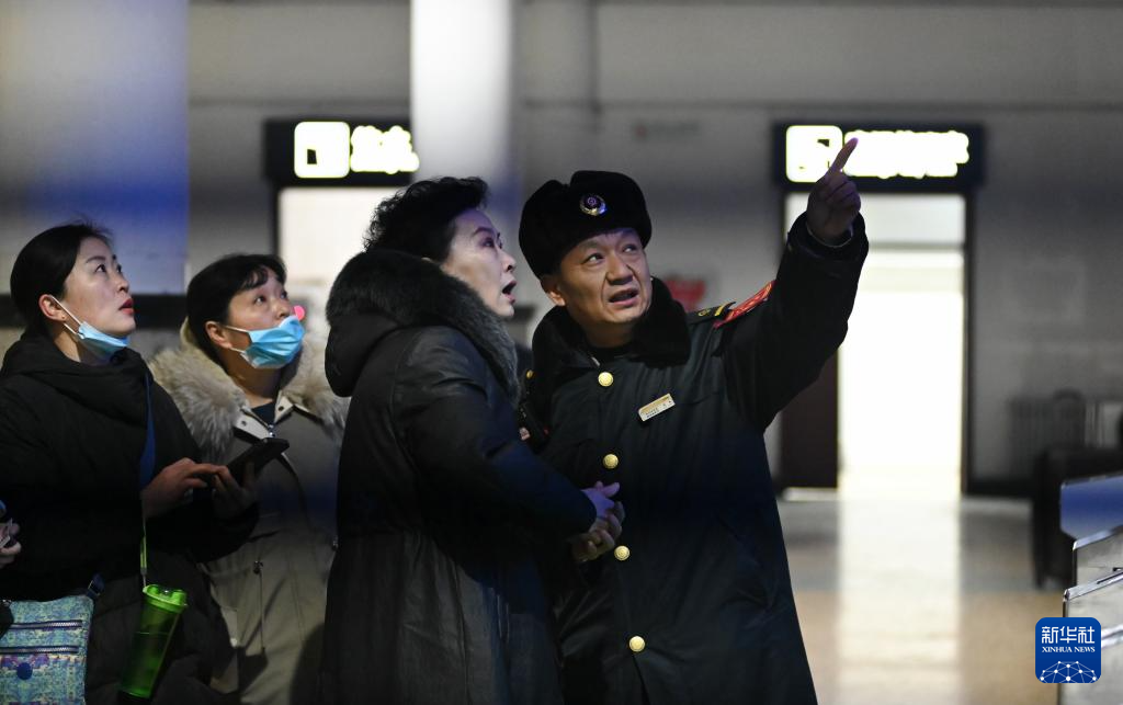 2月11日,在山东滕州火车站,工作人员在为旅客解答车次问题。