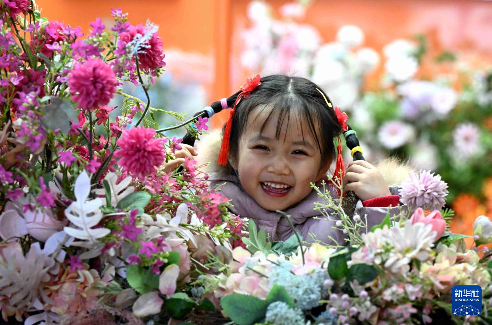 2月12日晚,小朋友在河北省石家庄市湾里庙步行街公共花房玩耍。