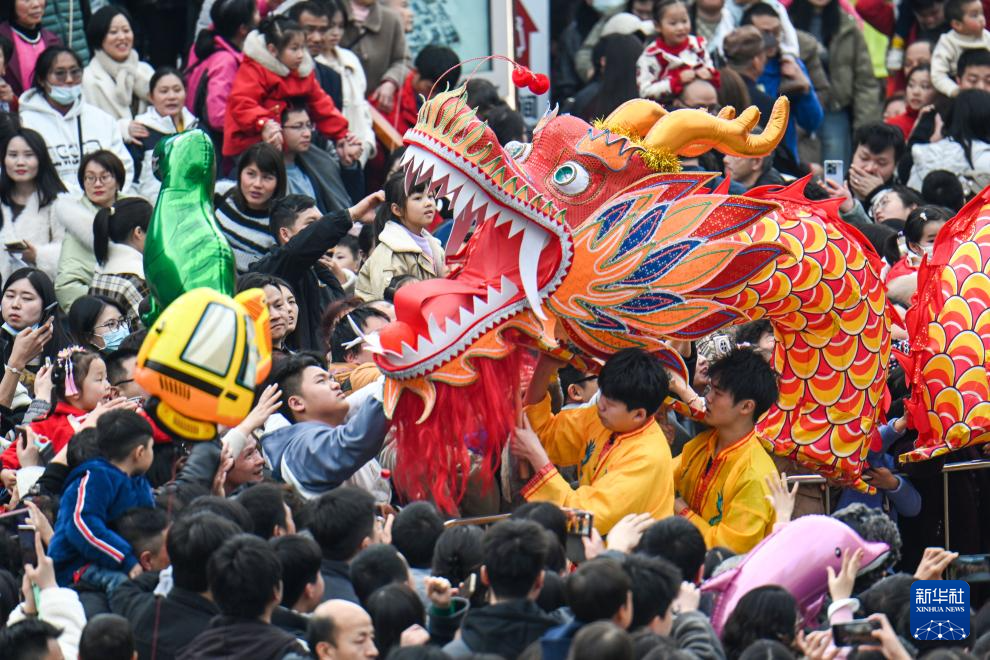 2月12日,市民在重庆市南川区东街古镇观看舞龙表演。