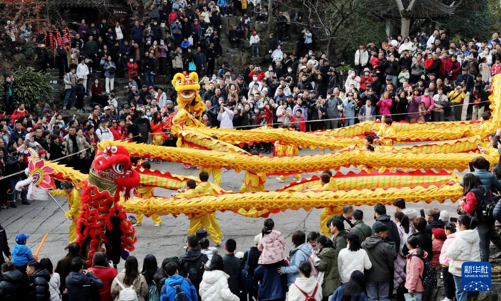 2月13日,游客在江苏苏州虎丘新春庙会上观看舞龙舞狮表演。