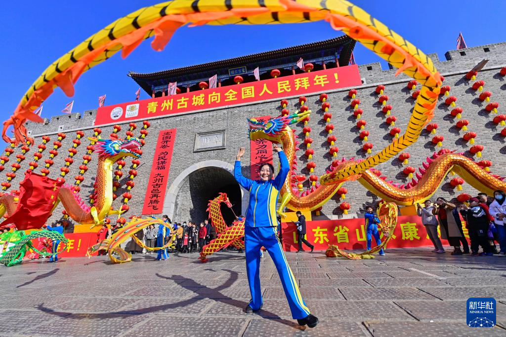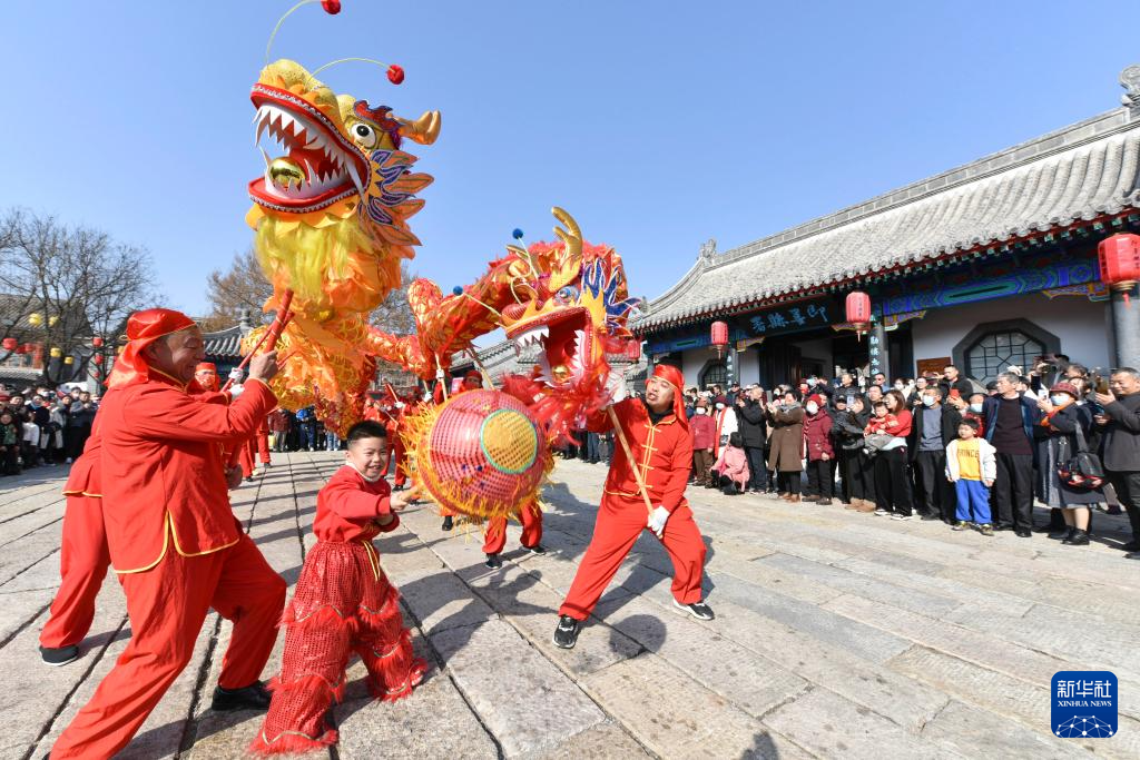 2月13日,市民在山东省青岛市即墨区即墨古城观看舞龙表演。