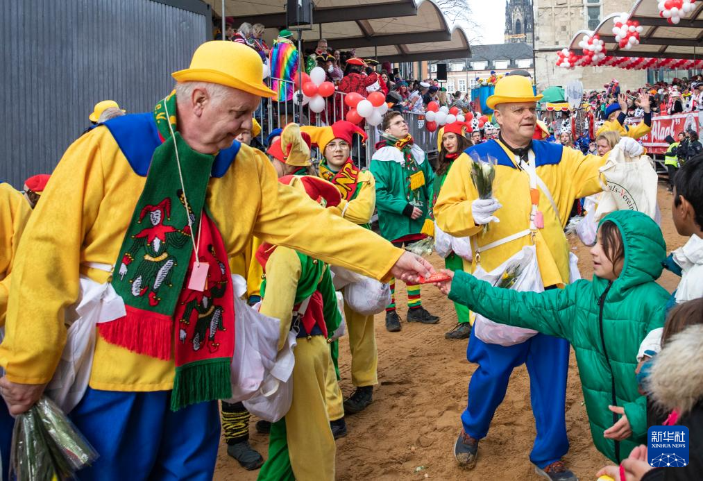 2月12日,在德国科隆举行的“玫瑰星期一”大游行上,狂欢者向小朋友发放巧克力。