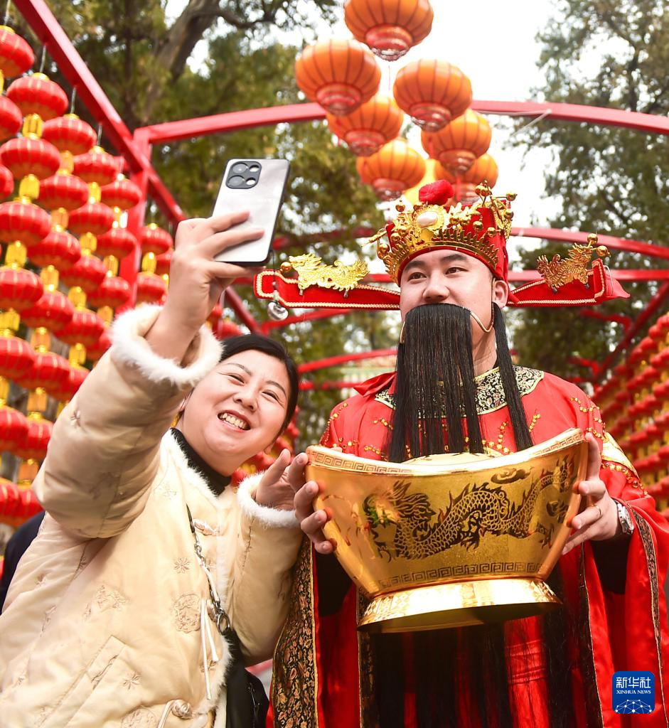 2月14日,在河南省洛阳市洛龙区关林庙会上,游客与“财神”合影。