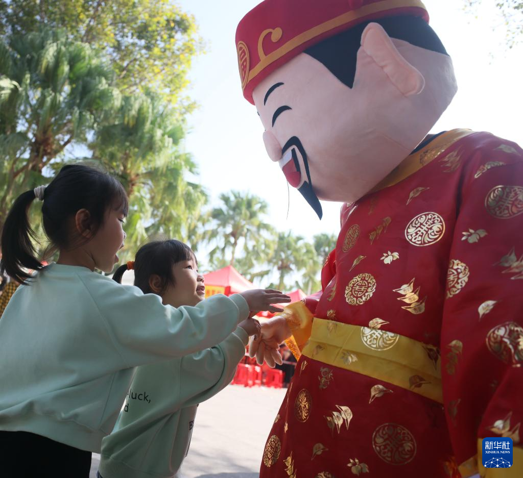 2月14日,在海南三亚南山文化旅游区举办财神文化节上,两名小朋友与“财神”互动。