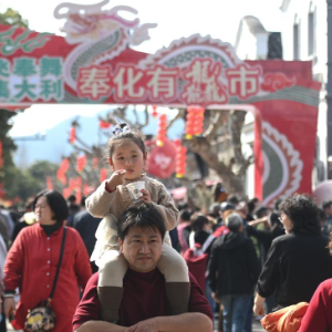 2月14日,游客在浙江省宁波市奉化区溪口镇三里长街街区游玩。