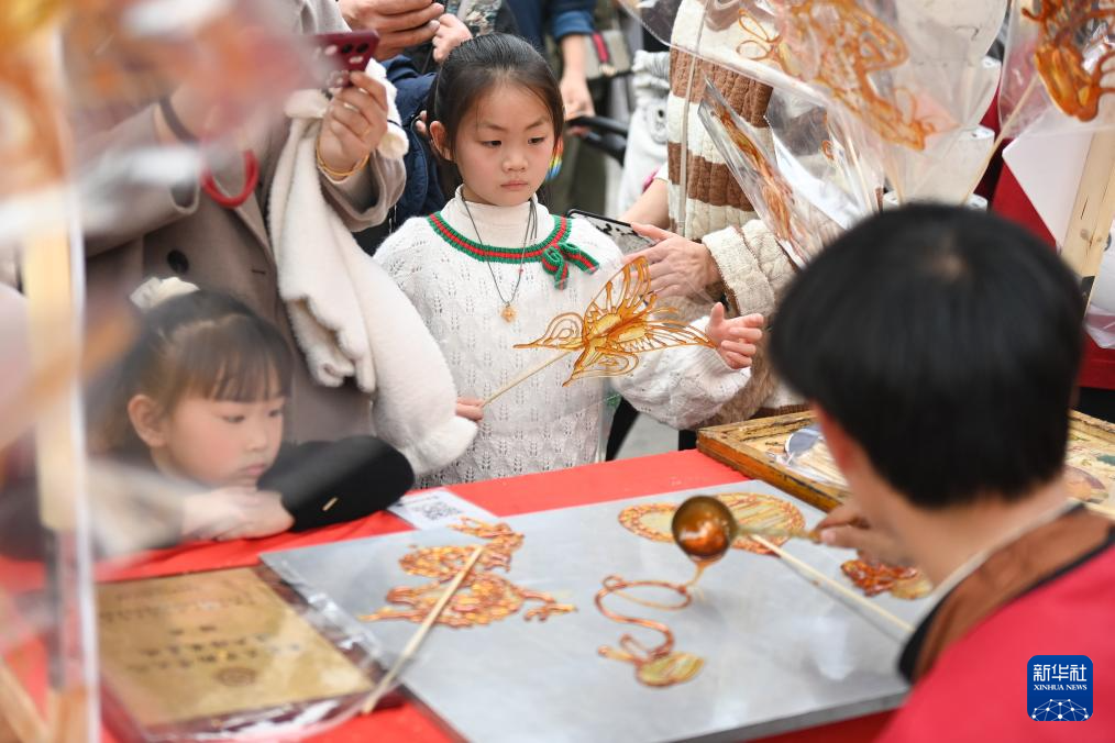 2月14日,游客在浙江省宁波市奉化区溪口镇三里长街街区市集观看糖画制作。