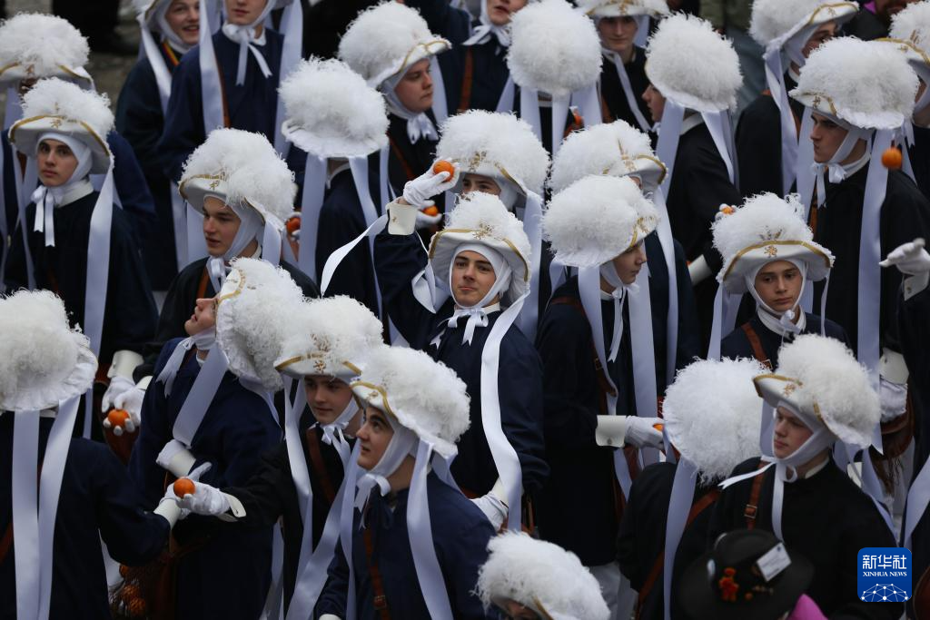 2月13日,在比利时南部小镇班什,装扮成“农夫”形象的小朋友将血橙扔向游客。据说,血橙代表祝福,接到或被扔到的人都会交好运。
