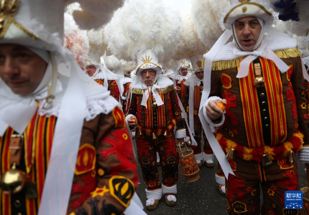 2月13日,在比利时南部小镇班什,装扮成“憨人”形象、头戴鸵鸟毛帽子的当地居民手拿血橙参加班什狂欢节游行。
