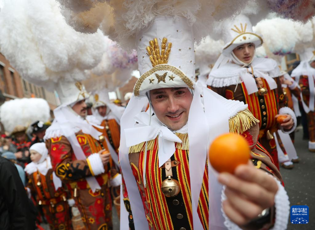 2月13日,在比利时南部小镇班什,装扮成“憨人”形象、头戴鸵鸟毛帽子的当地居民手拿血橙参加班什狂欢节游行。据说,血橙代表祝福,接到或被扔到的人都会交好运。