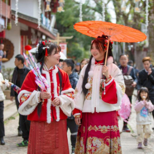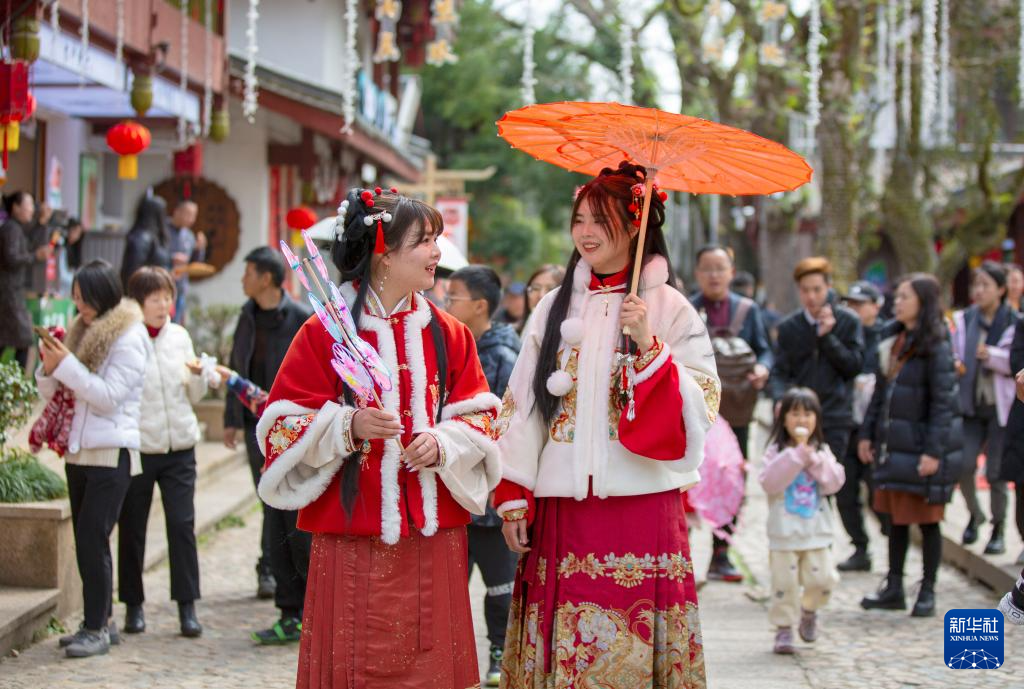 两名穿着传统服饰的游客在福建省武夷山市宋街集市游玩(2月13日摄)。