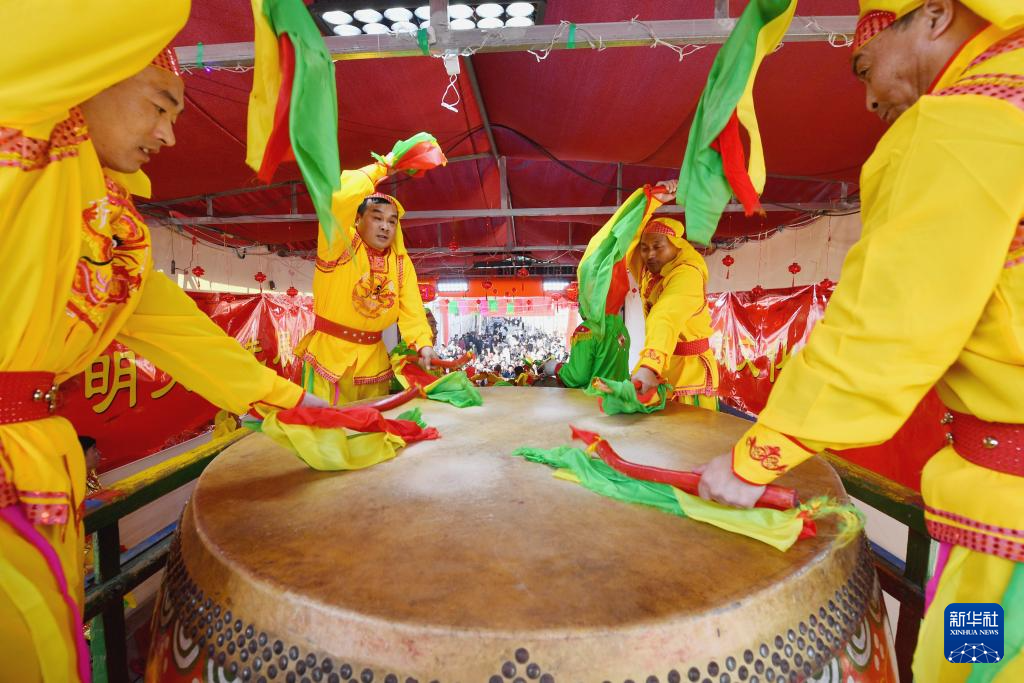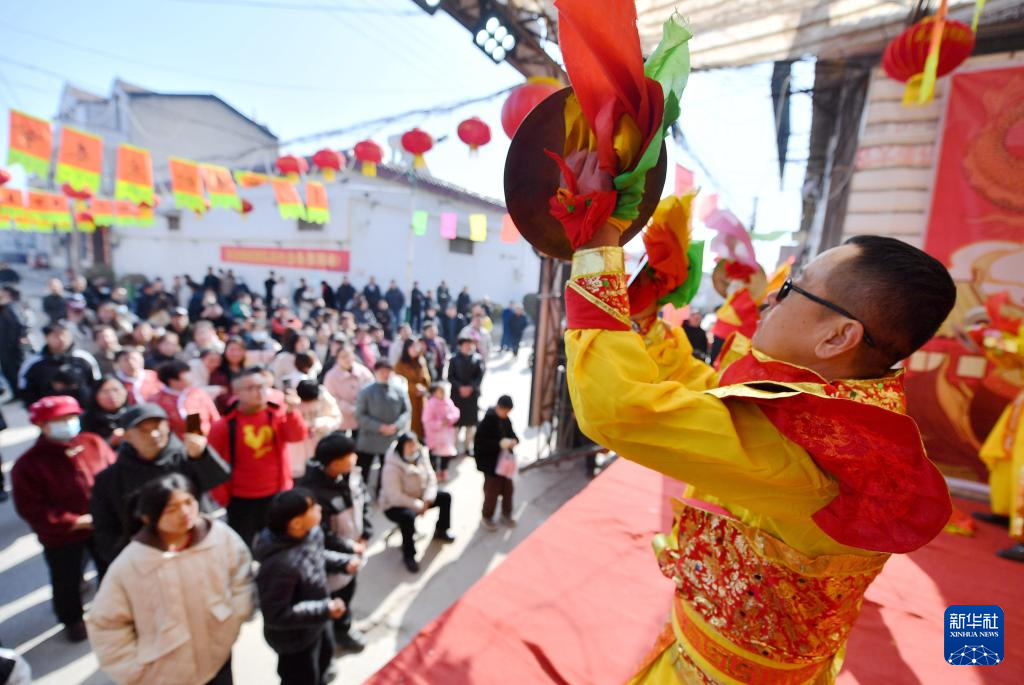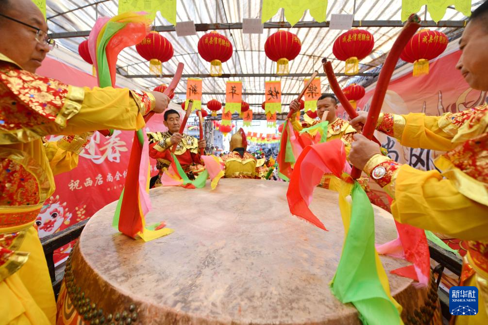 春节期间,河北省石家庄市无极县郝庄乡店尚村举办省级非遗项目“店尚对鼓”展演,吸引游客和周边群众前来观赏,感受非遗魅力。