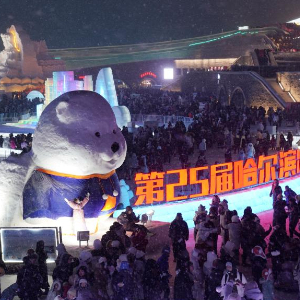 2月14日,游客在哈尔滨冰雪大世界园区内游玩。