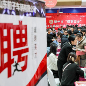 2月15日,求职者在山东省滕州市“榴枣归乡”2024年春风行动返乡人员专场招聘会上了解就业信息。