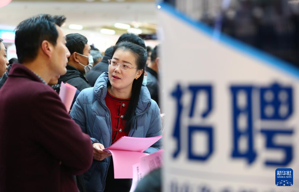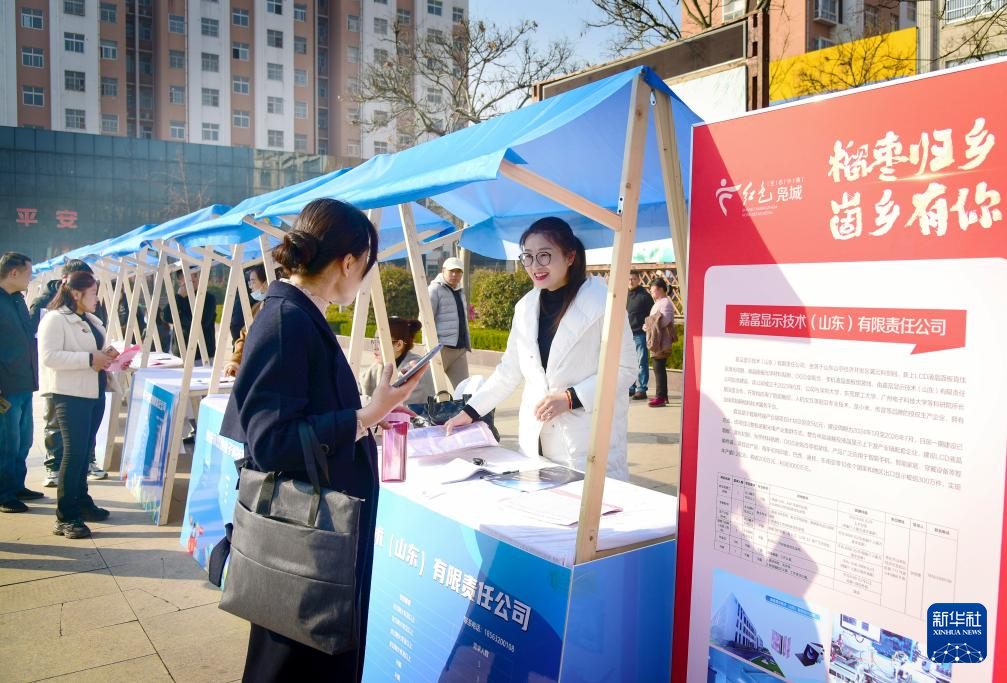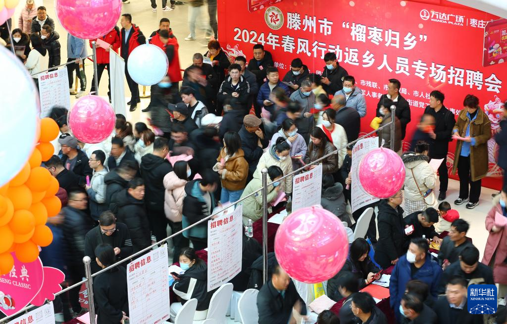 2月15日,求职者在山东省滕州市“榴枣归乡”2024年春风行动返乡人员专场招聘会上咨询就业信息。