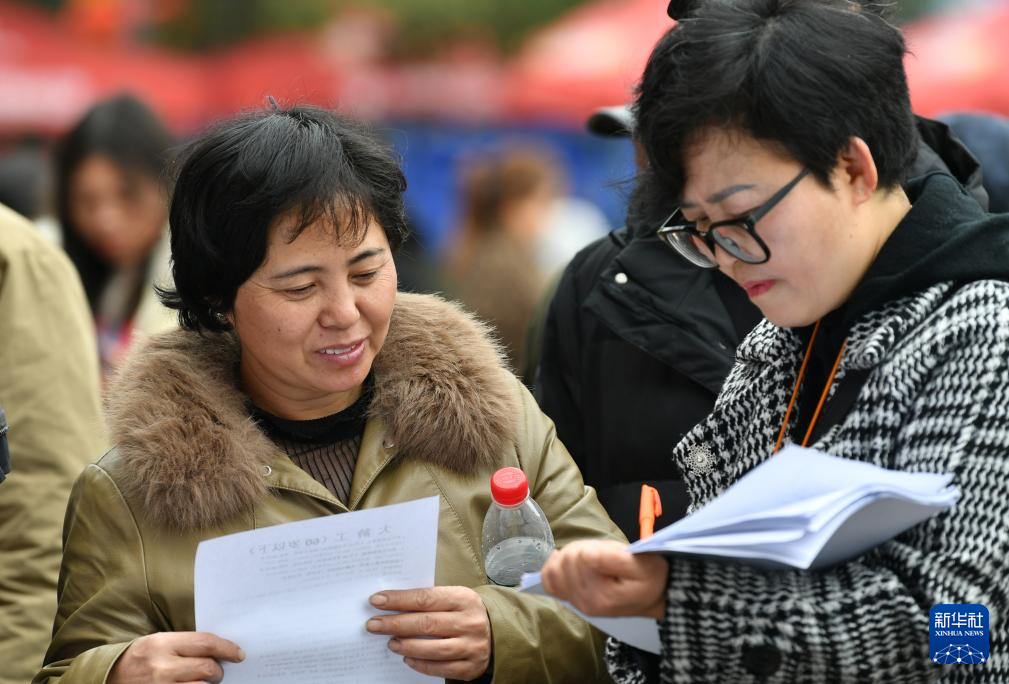 2月14日,求职者在河北省邢台市内丘县的“春风行动”大型招聘会上了解就业信息。