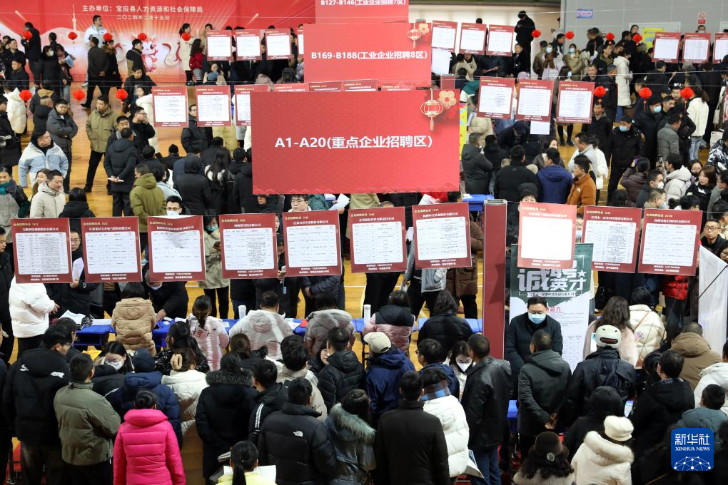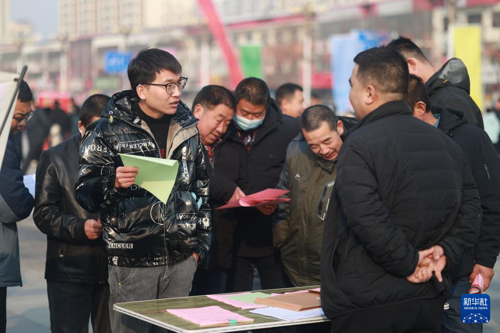 2月14日,在山东省枣庄市山亭区太清湖广场,求职者在“榴枣归乡·崮乡有你”优质岗位集中发布暨“春风行动”现场招聘会上了解就业信息。