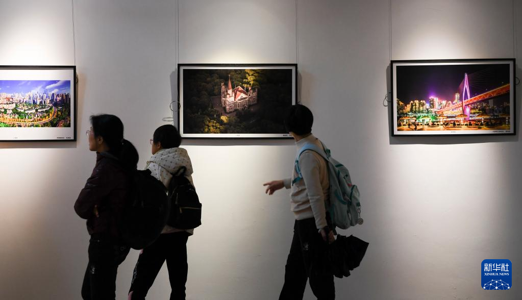 2月15日,游客在重庆市江北区北仓文创街区观看摄影展。