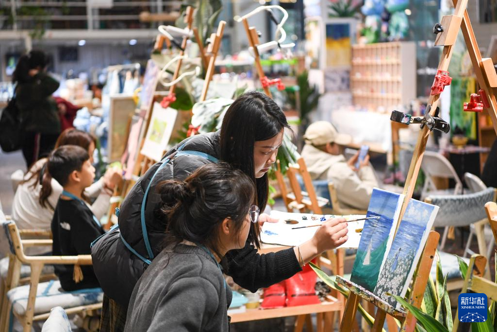 2月15日,游客在重庆市江北区北仓文创街区体验绘画。