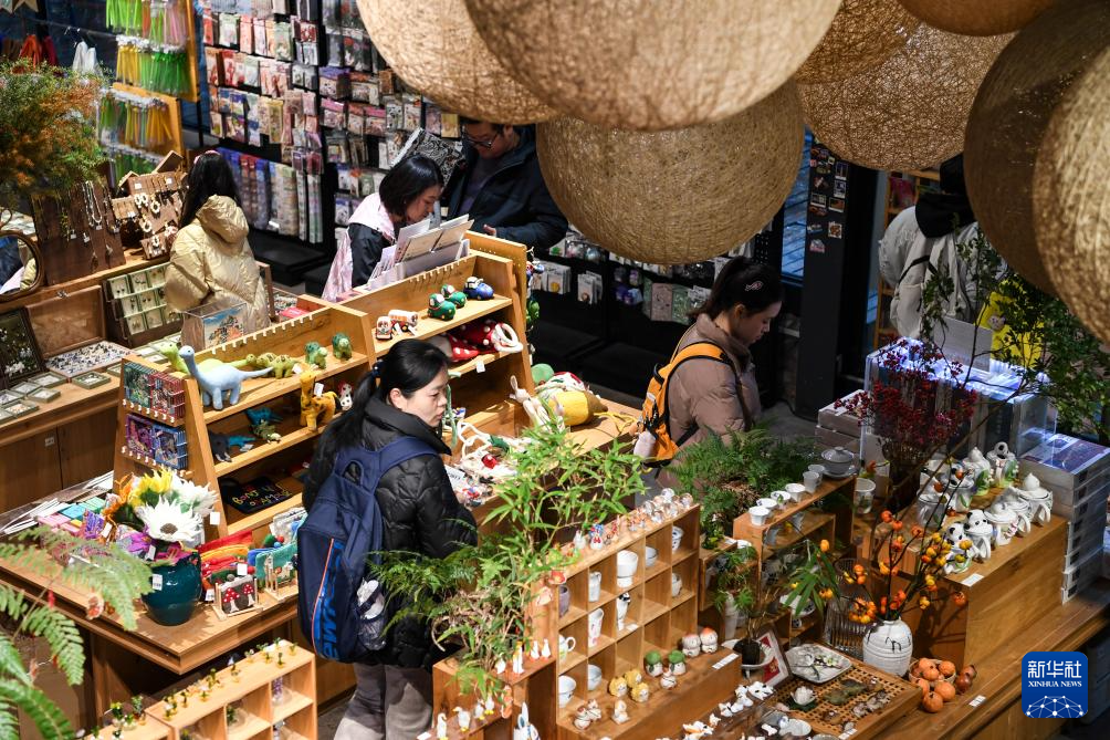 2月15日,游客在重庆市江北区北仓文创街区选购文创商品。
