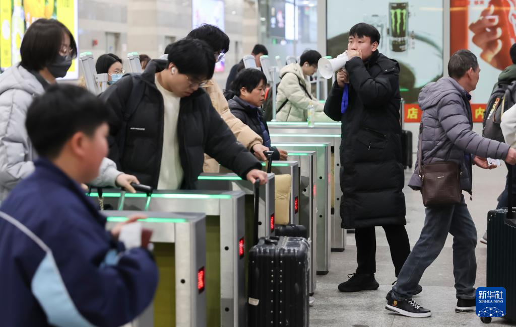 2月17日,铁路部门工作人员(中)在上海虹桥站出站口引导旅客有序出站。