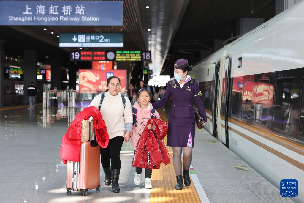 2月17日,在上海虹桥站,乘务人员引导旅客上车。