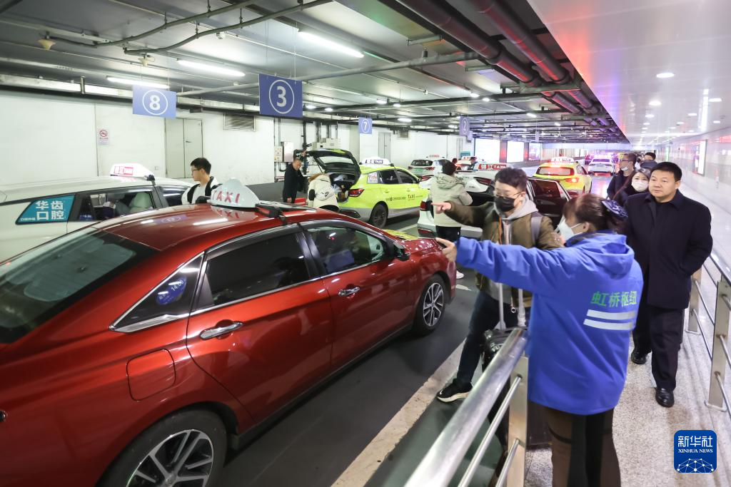 2月17日,在上海虹桥枢纽出租车上车点,工作人员引导乘客有序排队候车。