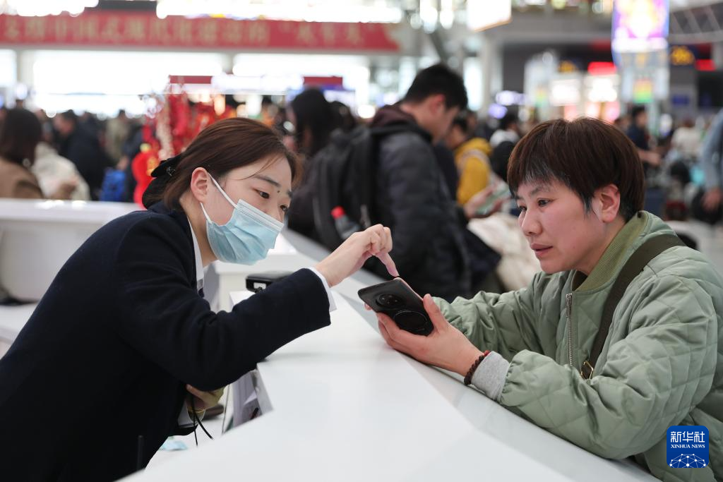 2月17日,上海虹桥站候车大厅服务台客运员在解答旅客问询。