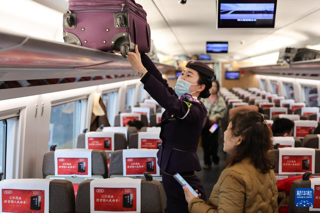 2月17日,在上海虹桥站,乘务人员在车厢内帮助旅客放置行李。