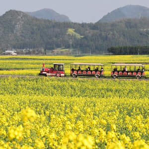 2月16日,游客乘坐观光车在云南省罗平县的油菜花海中游玩。