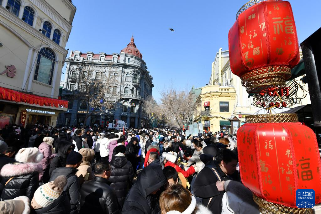 2月12日,游客在哈尔滨中央大街游玩。