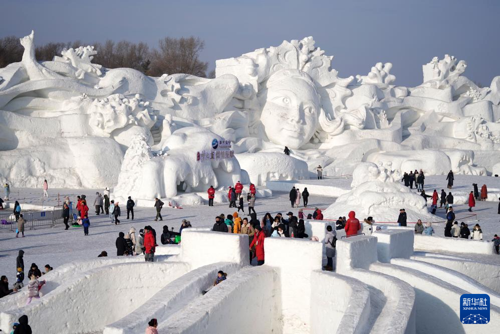 2月13日,游客在哈尔滨太阳岛雪博会园区内体验冰雪娱乐项目。