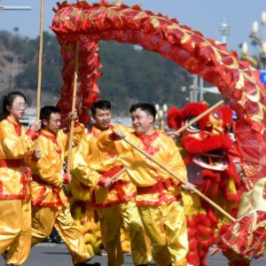 2月18日,人们在贵州省龙里县民俗踩街活动中舞龙。